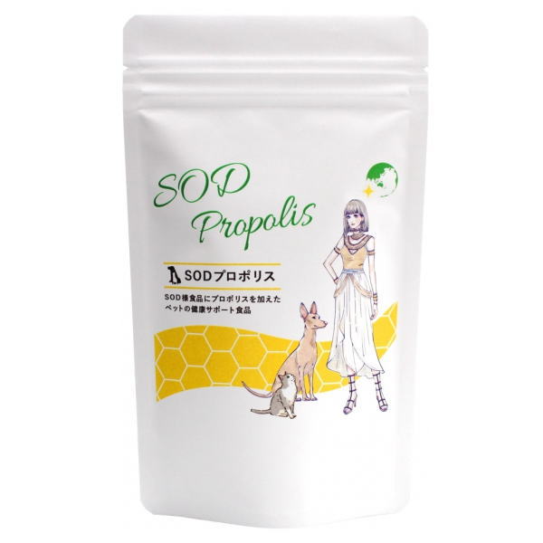 SODプロポリスは、古代エジプト時代から健康と美容に重用されてきたプロポリスと、生物が体内生成しているSOD酵素と似た働きを持つ食材と、それらをサポートする食材を組み合わせたペット用健康食品です。