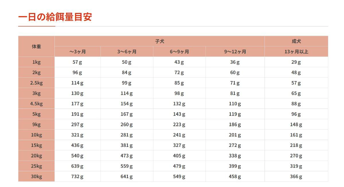 上記の給与量はあくまでも目安です。愛犬の犬種、運動量の多い少ない、健康状態、体重などによって給与量を調節し、与えすぎ、肥満に注意してください。